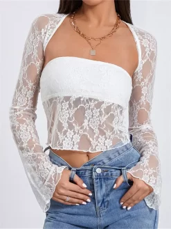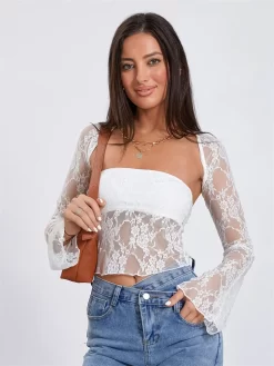 2 Piece Sets Women Tops Strapless Tube Tops with Lace Long Sleeve Shrug Y2K Sexy Fashion Tops and Blouses Summer Fall Shirts