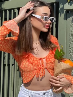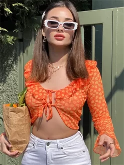 Women Front Tie-up Shirts Long Sleeve Plaid Stripe Ruffle Tops and Blouses Summer Fall Casual Elegant Blouse Streetwear