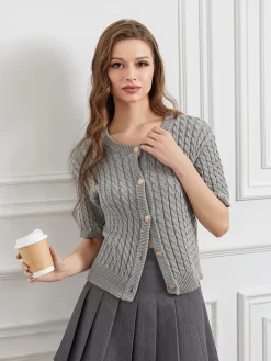 Women’s Cable Knit Cardigan Tops Solid Color Round Neck Short Sleeve Button-front Closure Shirts Sweaters