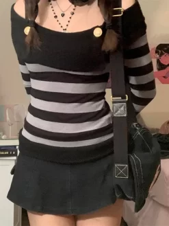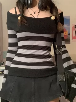 Womens Autumn Tops Y2K Aesthetic Gothic Retro Clothes Off Shoulder Long Sleeve Shirts Striped Slim Fit Tops and Blouses