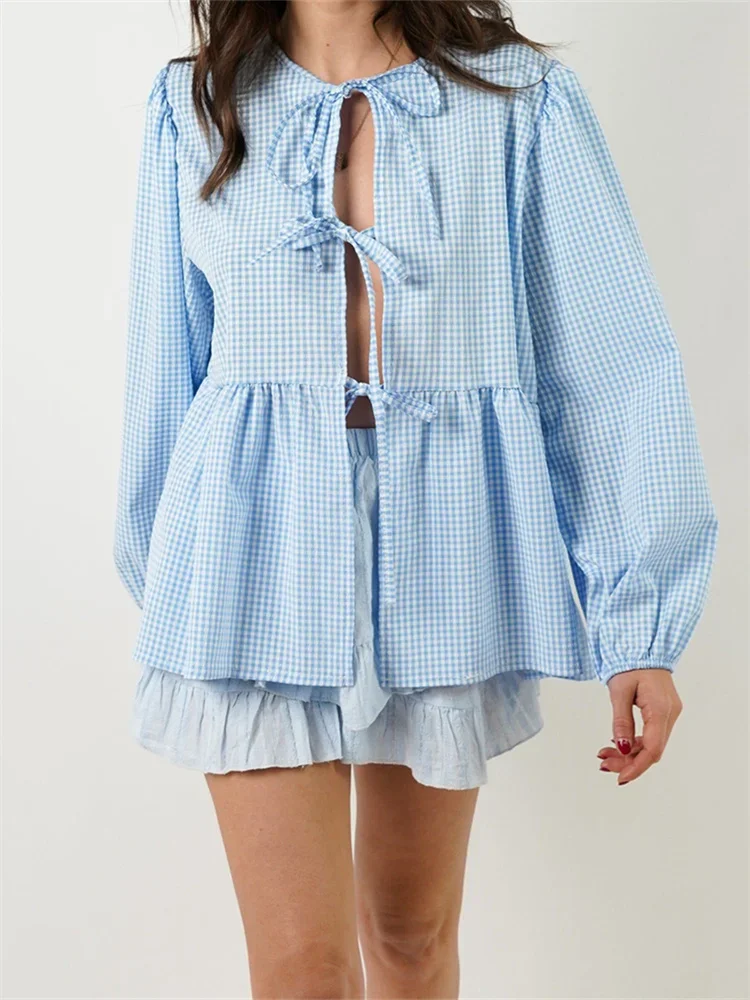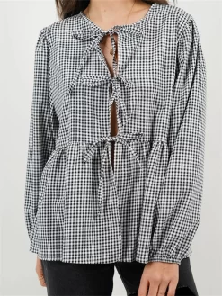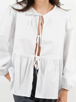 Womens Tie Front Tops Long Sleeve Round Neck Hollow Out Loose Babydoll Shirts Spring Fall Blouses