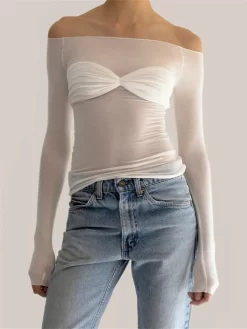 Women Y2K Mesh Blouse Long Sleeve Off Shoulder Ruched Twist Corset Crop Tops See Through Sexy Chic Shirts 2024 Summer Fall